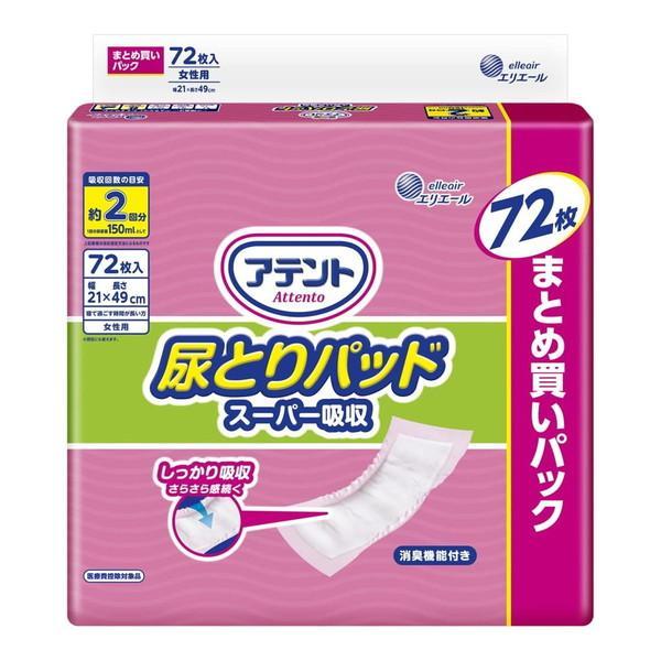 【ケース販売:4個入】 アテント 尿とりパッド スーパー吸収 約2回分 女性用 72枚 テープタイプ用 しっかり吸収 尿が逆戻りしにくい モレ防止 大王製紙 エリエール《商品説明》●尿が逆もどりしにくく、しっかり吸収でさらさら感続く●あてやすい工夫●カーブ形状のパッドで体にフィットしやすい。●消臭機能付き●ズレ止めテープ付き(粘着式1ヶ所)●さらさら感続く吸収体●尿が逆戻りしにくく、お肌はさらさら快適です。《仕様》■個装サイズ:334×362×140mm(高さ×幅×奥行)■素材 ・表面材:ポリオレフィン系不織布・吸水材:綿状パルプ、吸収紙、高分子吸水材・防水材:ポリエチレンフィルム・止着材:スチレン系エラストマー合成樹脂材・伸縮材:ポリウレタン・結合材:スチレン系エラストマー合成樹脂材■内容量:72枚■セット数:4パック【使用上の注意】(ご使用前に必ずお読みください)■お肌に合わないときは、ご使用を中止して、医師にご相談ください。■誤って紙おむつを口に入れたり、のどにつまらせたりすることがないように保管には十分注意し、使用後はすみやかに処理してください。 万一、紙おむつの一部を食べてしまった場合は、早急に最寄りの医師